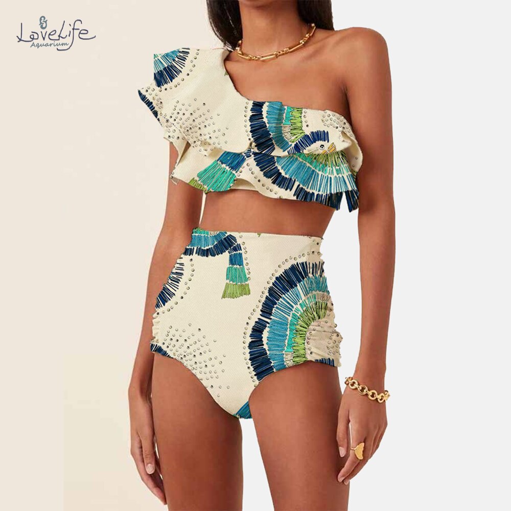One-Shoulder Embroidered Printed Ruffled Push Up Micro Swimsuit Two Pieces Plus Tankini Women Swimming Suits Swimwear Patchwork